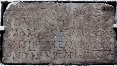 - In hoc tumulo re/quiescit boneme/morius Ursus qui vi/xit in pace annus(!) XXV / obiit K(alendis) Ian(uariis) p(ost) c(onsulatum) Abieni iun(ioris) v(iri) (!) con(sulis)