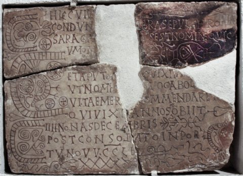 - Hic cuiu(s) in hoc / condun[tur] membra sepulchro / Saraga [dict]us est nomine qui c/um om[nibus] / et apu<d=T> om[nes] vixit an[nos ---] / ut nomin[is sui] vocabol[um!] / vitae mer[i]tis commendaret / qui vixit annos XL obiit / IIII Nonas Decembr<e=I>s / post consolato(!) Inpor/tuno(!) v(iri) {v} c(larissimi) c(onsu)l<is=E> / XXXX