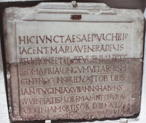 - Hic iunctae s{a}epulchris / iacent Maria venerabilis / religione et eius Eugenia neptes / sed Maria longum vitae c(u)rs(u)m / centeno console duxit ob(iit) d(ie) Id(ibu)s / Ian(uarii)s Eugenia XVIII ann(o)s habens / iuventatis florem amisit durae / viol<e=I>ntia mortis ob(iit) d(ie) III K(a)l(enda)s / Ianuarias XII p(ost) c(onsulatum) Iustini ind(ictione) prima
