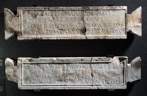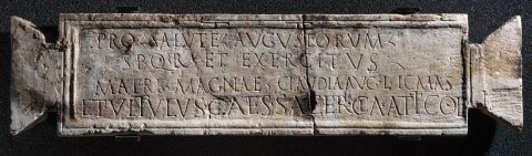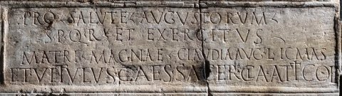- Pro salute Augustorum / s(enatus) p(opuli)q(ue) R(omani) et exercitus / Matri Magnae Claudia Aug(usti) l(iberta) Icmas / et Vitulus Caes(aris) sacer(dote) Cla(udio) Attico li(berto)