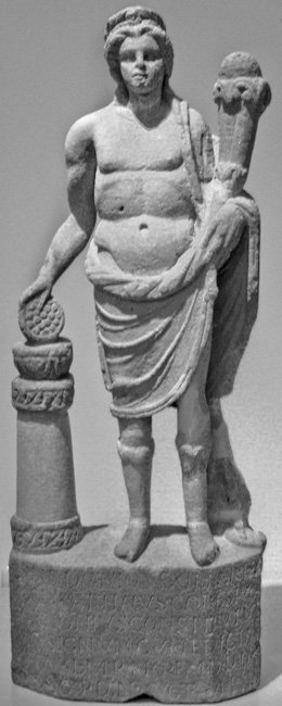 - Mythische Figur: an einem säulenförmigen Altar opfernder Genius mit Kranz und Füllhorn. Inschrift auf der polygonalen Basis.