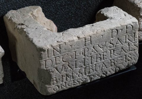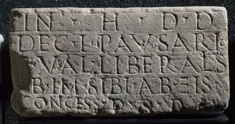 - In h(onorem) d(omus) d(ivinae) / dec(uriae) I pausario(rum) / [T(itus)] Val(erius) Liberalis / ob im(munitatem?) sibi ab eis / concess(am) d(e) s(uo) d(ono) [d(edit)]