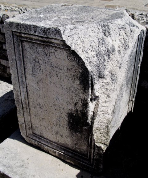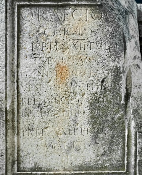 - Q(uinto) Raecio Q(uinti) f(ilio) / Cl(audia) Rufo / p(rimo) p(ilo) leg(ionis) XII Fulm(inatae) / trecenario / donis don(ato) ab Imper(atore) / Vespasian(o) et Tito Imp(eratore) / bell(o) Iud(aico) ab imp(eratore) Trai(ano) / bell(o) Dac(ico) princ(ipi) praet(orii) / Trebia M(arci) f(ilia) Procul(a) / marito / t(itulum) p(oni) i(ussit)