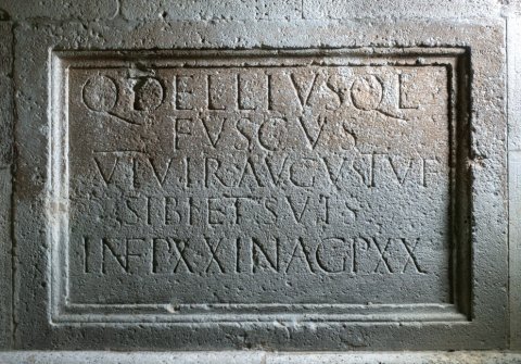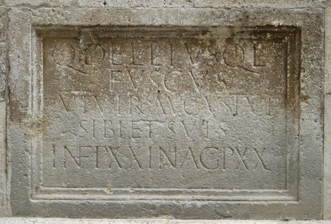 - Q(uintus) Dellius Q(uinti) l(ibertus) / Fuscus / VIvir August(alis) v(ivus) f(ecit) / sibi et suis / in f(ronte) p(edes) XX in ag(ro) p(edes) XX