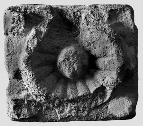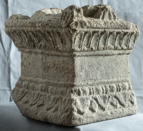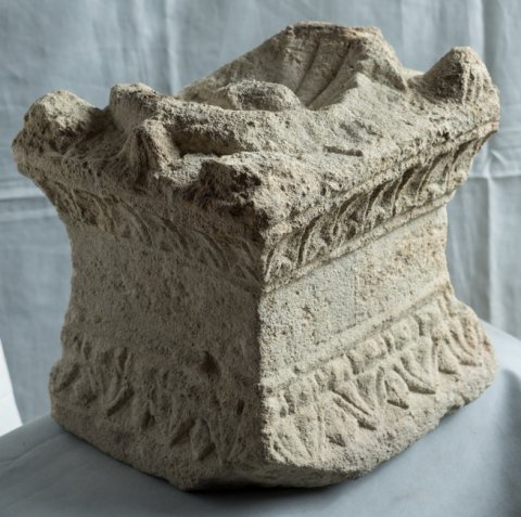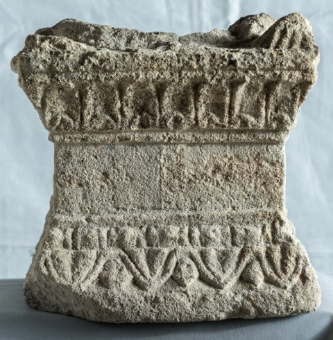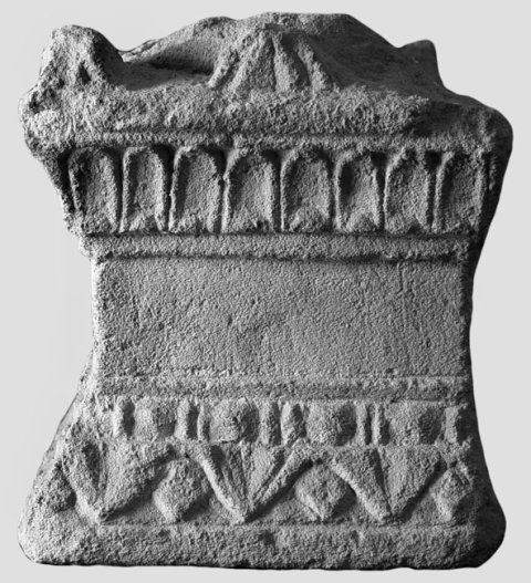 - Unten lesbisches Kyma und Perlstab, oben Kyma mit Pfeifenblättern, darüber Giebel mit Eckakroteren. In der Oberseite Omphalosschale.
