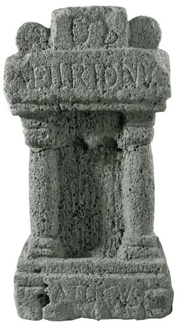 - Aediculaförmiger Altar mit Nische zwischen Säulen und kubischem Aufsatz zwischen pulvini.