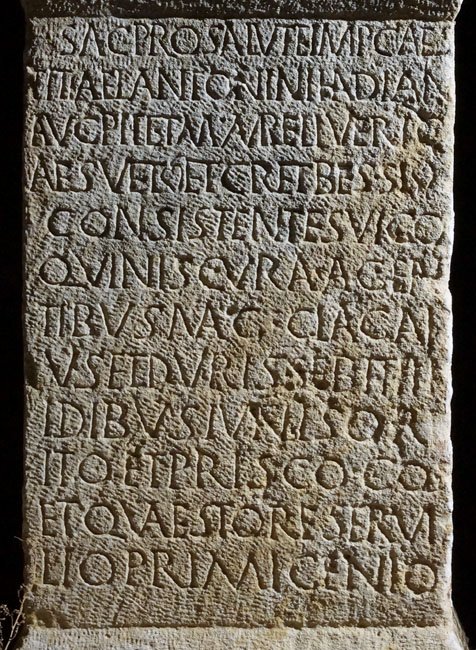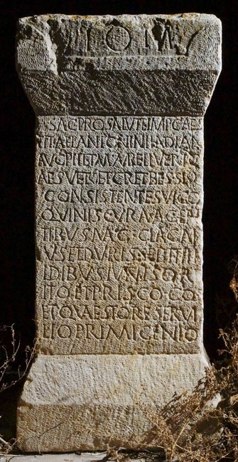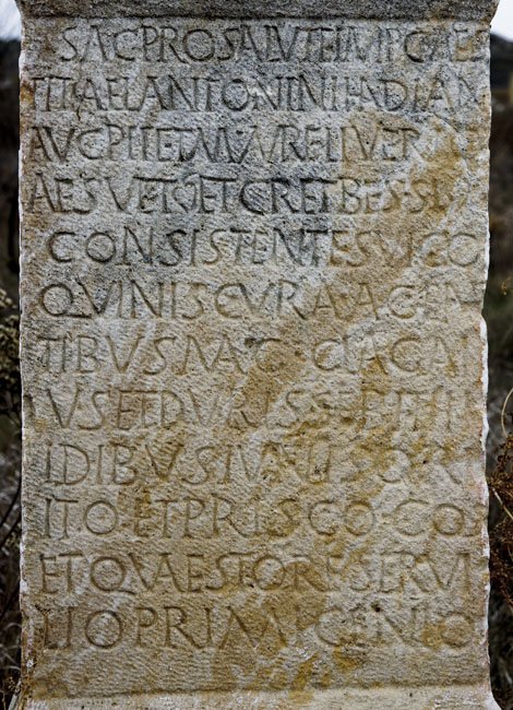 - I(ovi) O(ptimo) M(aximo) // sac(rum) pro salute Imp(eratoris) Caes(aris) / Titi Ael(i) Antonini Had(r)iani / Aug(usti) Pii et M(arci) Aureli Veri C/aes(aris) vet(erani) et c(ives) R(omani) et Bessi / consistentes vico / Quin(tion)is cura(m) agen/tibus mag(istris) Cla(udio) Gai/us(!) et Durisse Bithi / Idibus Iuni(i)s Orf/ito et Prisco co(n)s(ulibus) / et quaestore Servi/lio Primigenio