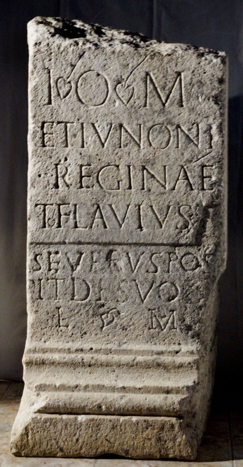 - I(ovi) O(ptimo) M(aximo) / et Iunoni / Reginae / T(itus) Flavius / Severus pos/[u]it de suo / l(ibens) m(erito)