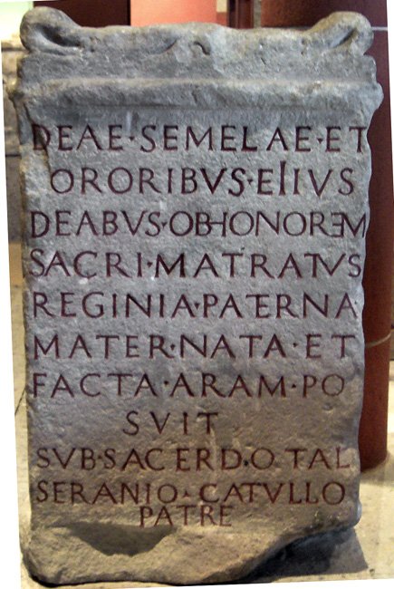 - Deae Semelae et / sororibus ei{i}us / deabus ob honorem / sacri matratus / Reginia Paterna / mater nata et / facta aram po/suit / sub sacerdotal(i) / Seranio Catullo / patre