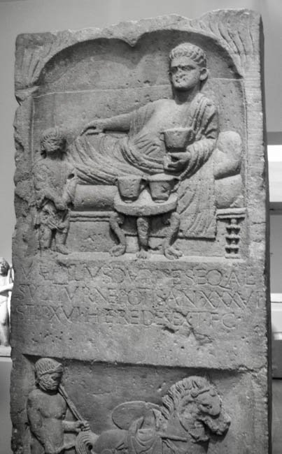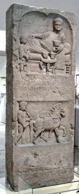- Muschelnische mit Tottenmahl: gelagerter bartloser Mann in Tunica und Mantel, Becher in der Linken. Vor der Kline Tisch mit Gefäßen, links Diener. Sockelrelief mit Calo und Pferd. Waffen: Helm, Speere, Schild.