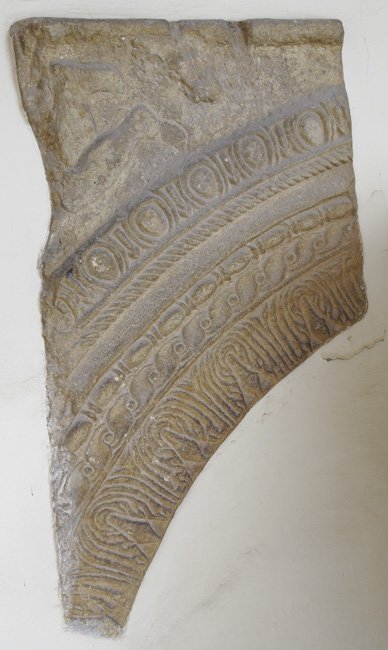 - Profiliert gerahmte Bogenöffnung (von innen: Kyma, Flechtband, Astragalstab, tordiertes Band, Eierstab), im Zwickel darüber Beine einer schwebenden Figur (Erot ?).