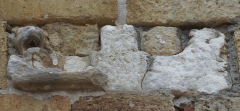 - vom rechten Löwen und dem Mittelteil nur Umrisse erhalten, zerbrochen