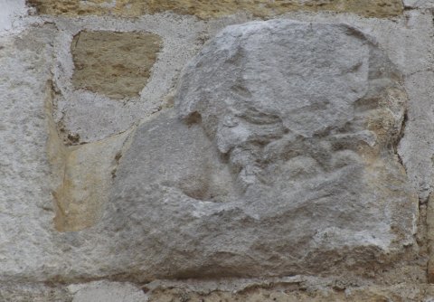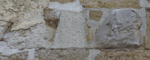 - Kopf mit Polos (?) zwischen liegenden Löwen