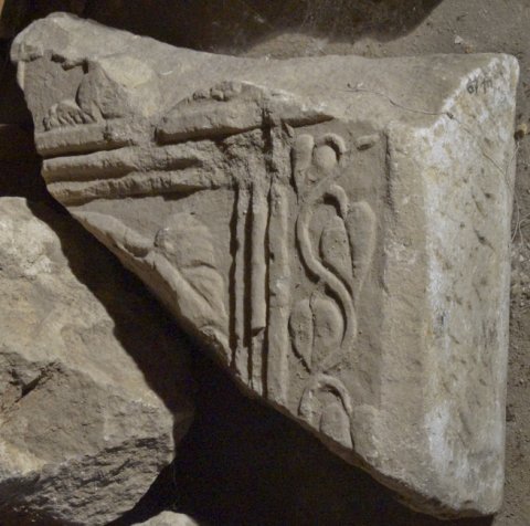 - Über einem gerahmten Bildfeld Meerwesen (Seepanther ?), vor ihm Dreizack (?). Vom Bildfeld nur obere rechte Ecke mit Weinblatt erhalten. Auf der seitlichen Rahmenleiste Efeuranke.