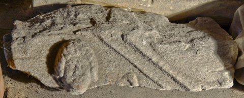 - Reste von zwei Relieffeldern mit Jünglings(?)kopf und Delphin (?). Fragment einer Kassettendecke ?