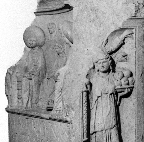 - Über dem Sockel mit der Votivinschrift drei thronende Matronen mit Fruchtschalen auf den Knien. Über der Rückenlehne der Sitzbank Büste von drei Personen. Seitlich links Diener, rechts Dienerin. Auf den Nebenseiten je eine Frau mit Fruchtschale und Girlande in den Händen.