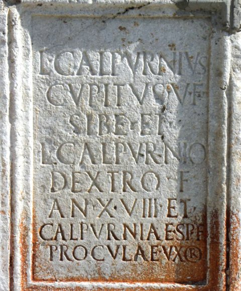 - L(ucius) Calpurnius / Cupitus v(ivus) f(ecit) / sibe(!) et / L(ucio) Calpurnio / Dextro f(ilio) / an(norum) XVIII et / Calpurniae Sp(uri) f(iliae) / Proculae uxor(i)