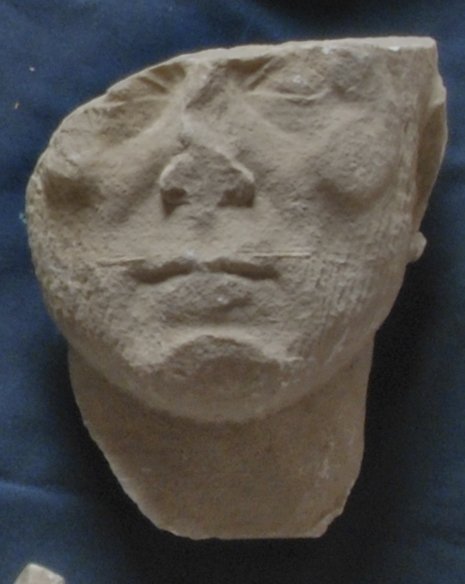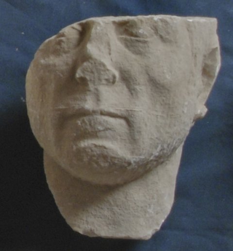 - im Halsansatz abgebr., Nase abgeschlagen, Oberkopf u. Stirn fehlen