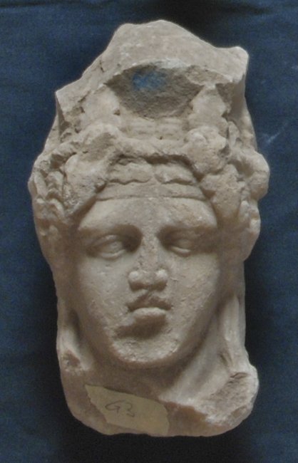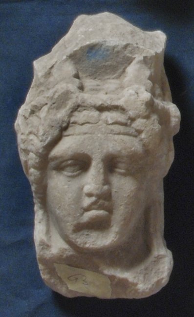 - Mythische Figur: Herme des jugendlichen Dionysos mit Schulterlocken und Binde über der Stirn.