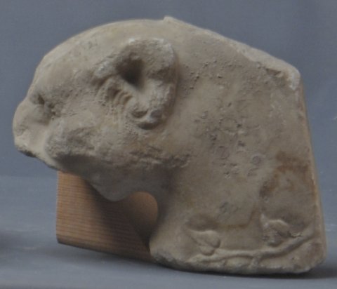 - Teil eines Möbelfußes. Pantherprotome mit Efeuranke um den Hals. An der rechten Seite Rest eines eckigen Auflagers.