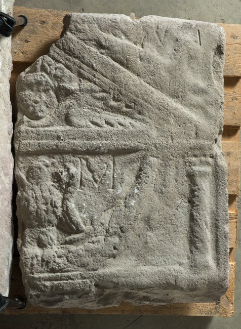 - Eingeschriebener Giebel, auf den Schrägen Delphine, im Feld Rosette zwischen Blättern. Im Hauptbild zwischen Säulen Adler mit ausgebreiteten Flügeln auf Girlande.