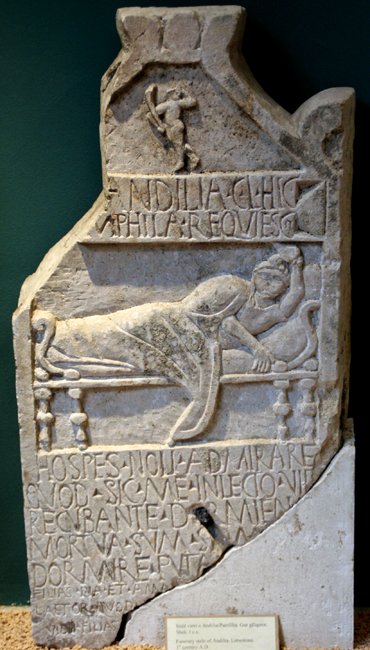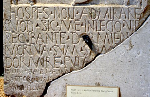 - [Sc]andilia C(ai) l(iberta) hic / [Pa]mphila requiescit // hospes noli admirare / quod sic me in lecto vid[es] / recubante(m) dormient[em] / mortua sum simi[---] / dormire puta[s ---] / filias pia et ama[---] / laetor quod [---] / vidi filias