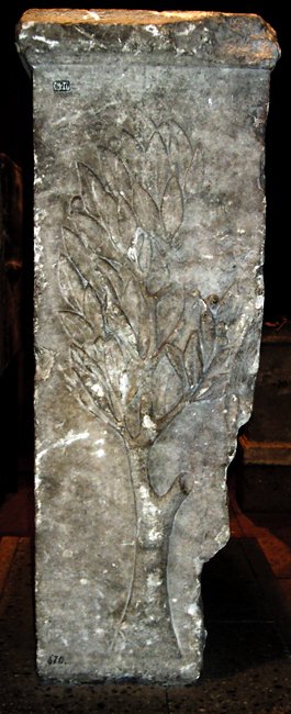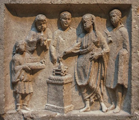 - Unter der Inschrift eingetieftes Relieffeld mit Opferszene (Togatus am Altar, drei Opferdiener, ein Knabe mit Kästchen). Auf den Nebenseiten je ein Baum mit Früchten.
