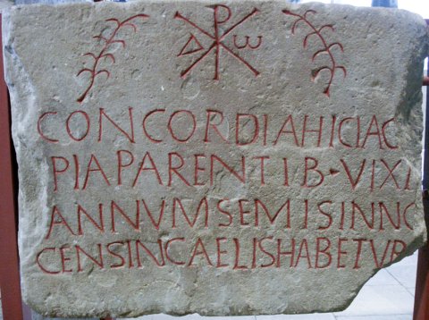 - Concordia hic iac[et] / pia paren(t)ib(us) vixi[t] / annum semis(sem) inno/cens in caelis habetur
