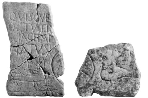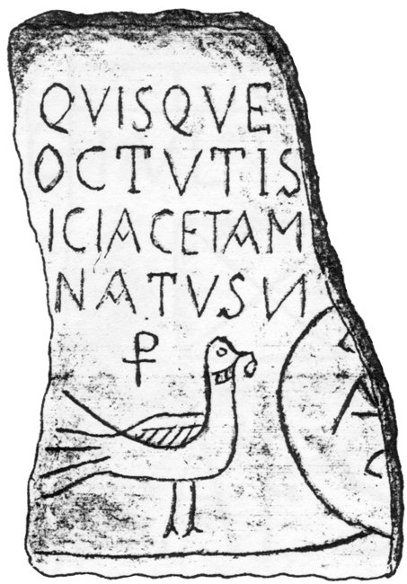 - unter der Inschrift Kreis mit Alpha und Omega (?), flankiert von Tauben und Christogrammata