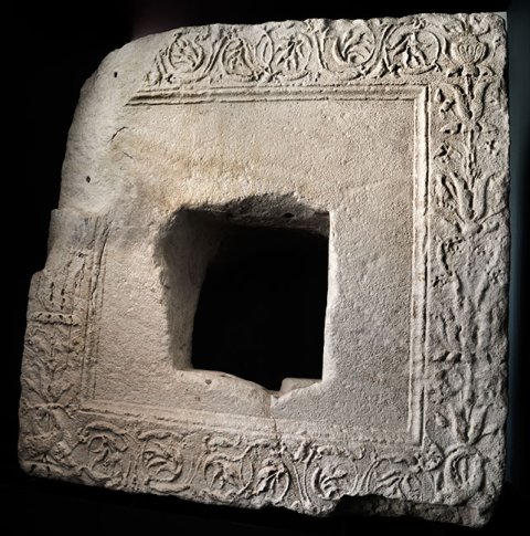 - Sockel u. Bekrönung fehlen, untere linke Ecke verbr., in der Rückseite viereckige Aushöhlung.
