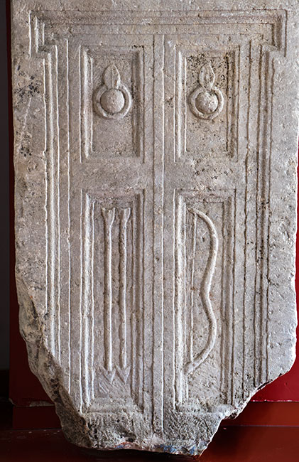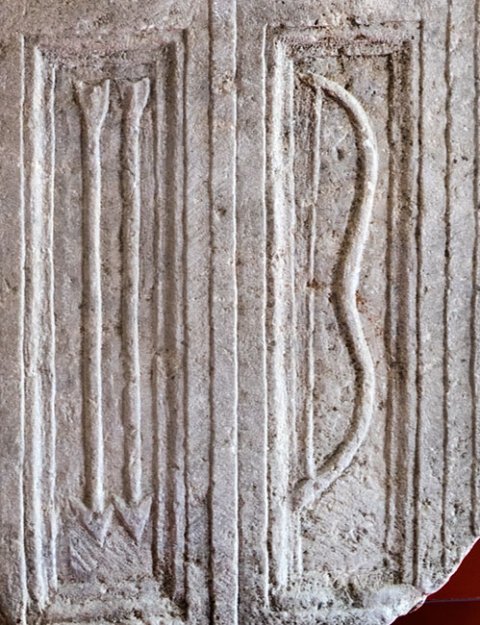- Giebel mit Rosette und Seitenakroteren. Unter dem Schriftfeld Türrelief mit vier profiliert gerahmten Kassetten. In den beiden unteren Waffen: rechts Bogen, links zwei Pfeile.
