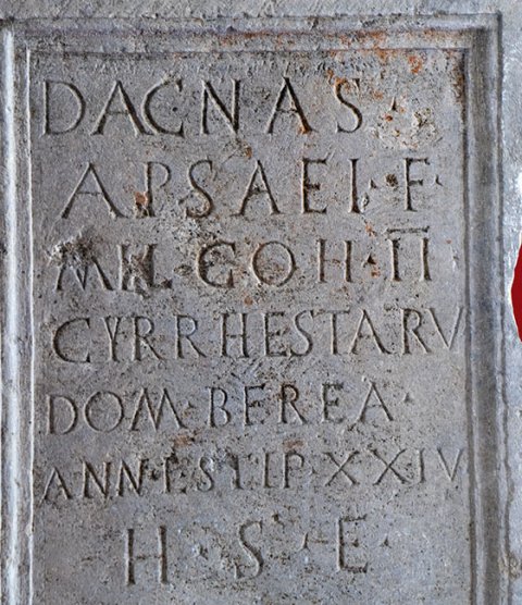 - Dacnas / Apsaei f(ilius) / mil(es) goh(ortis!) II / Cyrrhestaru(m) / domo Berea / ann(orum) L stip(endiorum) XXIV / h(ic) s(itus) e(st)