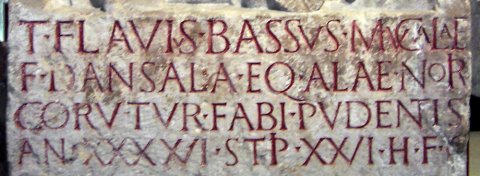 - T(itus) Flavius Bassus Mucalae / f(ilius) Dansala eq(ues) alae Nori/coru(m) tur(ma) Fabi Pudentis / an(norum) XXXXVI stip(endiorum) XXVI h(eres) f(aciendum) c(uravit)