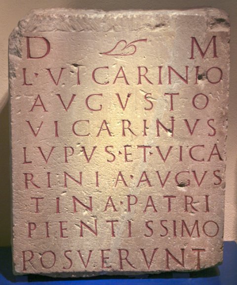 - D(is) M(anibus) / L(ucio) Vicarinio / Augusto / Vicarinius / Lupus et Vica/rinia Augus/tina patri / pientissimo / rosuerunt (!)