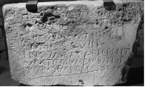 - Hic ia[cet in p]ac[e] r[e]/qui[escit ---] funere / raptus qui vixit annus (!) / XI menses VIII / in sua fata recessit / (h)unc titolum (!) parentis (!) e/x consenso (!) fecerunt
