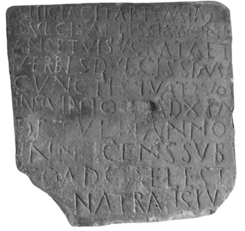 - Hic iac<e=I>t Artemia / dulcis aptissimus inf/ans et visu grata et / verbis dulcissima / cunctis quattuor / in quinto ad Chr(istu)m / detulit annos / innocens subi/to ad caelesti[a] / [reg]na transivi[t]