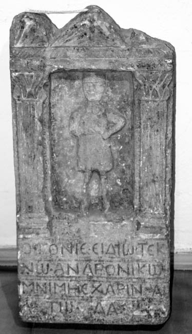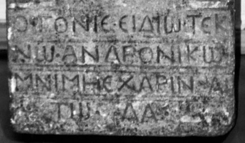 - griechisch: οἱ γονῖ<ς> ∙ εἰδίῳ τέκ/νῳ Ἀνδρονίκῳ / μνίμη<ς> {μνήμης} χάριν, αἰ/τῶ(ν) {ἐτῶν} λα