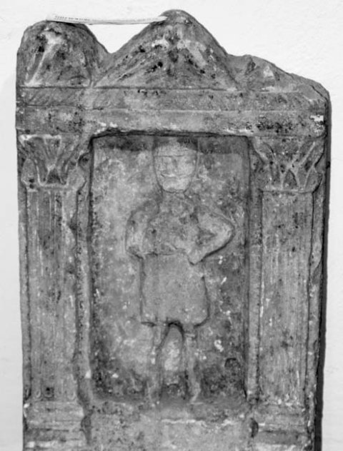 - Über der Inschrift Bildnische mit Giebel auf kannelierten Pilastern, darin stehende Ganzfigur in kurzer Tunica.