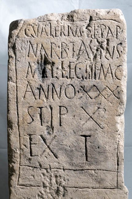 - G(aius!) Valerius G(ai!) f(ilius) Pap(iria) / Narb(o) Taurus / m[i]l(es) leg(ionis) IIII Mac(edonicae) / anno(rum) XXX / stip(endiorum) X / ex t(estamento)