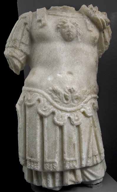 - Stehender Mann (Offizier ? Kaiser ?) im Muskelpanzer mit Pteryges und Streifenschurz, auf der Brust Gorgoneion, auf der linken Schulter Mantelbausch.