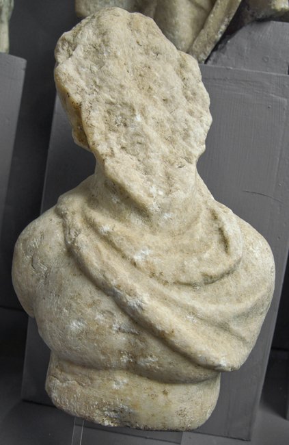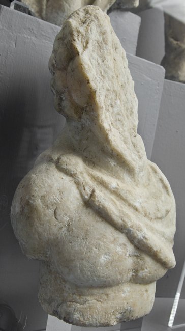 - Büste eines bärtigen Mannes, Mantel mit Scheibenfibel. Armstümpfe nach hinten gezogen, Kopf zur rechten Schulter geneigt. Gefangener Barbar ?