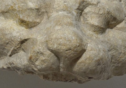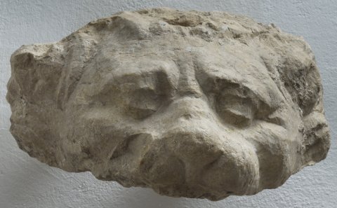 - nur vorderer Teil es Oberkopfes erhalten, oben Dübelloch, im Maul runde Ausnehmung