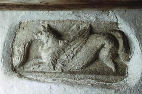 - Blattkelch, rechts davon Meerwesen (Seegreif)