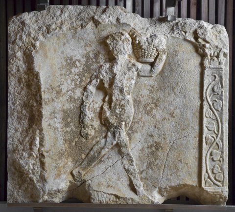 - Mythische Figur: Laufender nackter Satyr (Jahreszeit ?), Korb mit Weintrauben auf der linken Schulter, in der Rechten Traube (?). Rechts Pilaster mit Efeuranke und Blattkapitell.