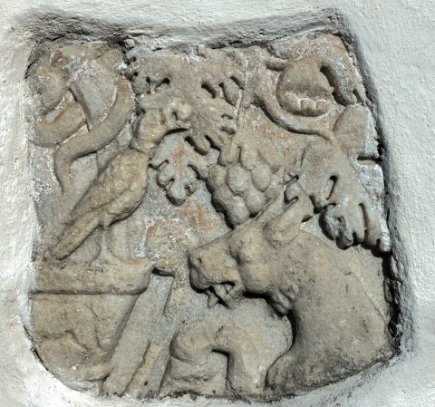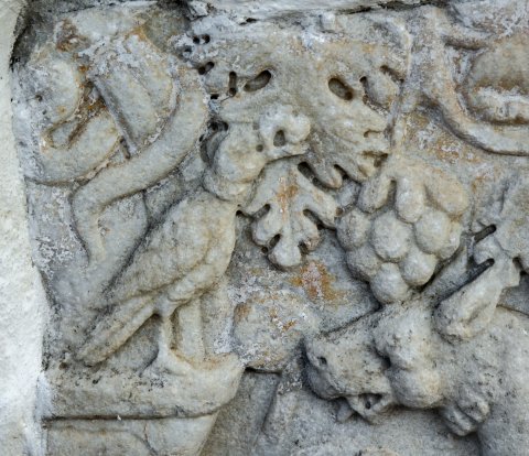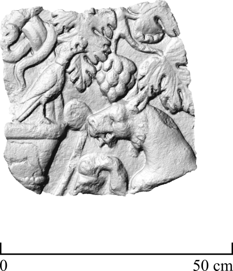 - Krater mit Weinstock und Tieren (auf dem Weinstock Schlange, auf dem Gefäßrand Vogel mit Halsband, seitlich Panther mit erhobener Pranke). Krater mit Volutenhenkeln und Tierrelief.