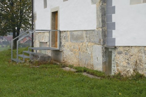 - an der Nordseite der Kirche Sv. Peter (östlich von Trebnje, Ortsbezeichnung Jezero) quer zum Mauerwerk liegend verbaut.
