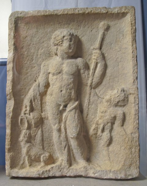 - Mythische Figuren: jugendlicher Dionysos-Liber Pater mit Thyrsos und Kantharos, an seiner linken Seite Pan, neben dem rechten Fuß Panther.