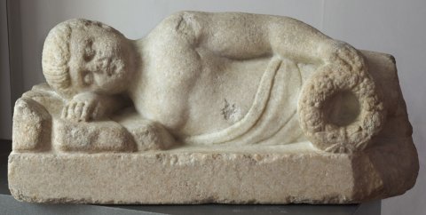 - Auf seiner rechten Seite liegender schlafender Knabe mit Mantel um die Hüften, rechter Arm unter dem Kopf, in der Linken Kranz.