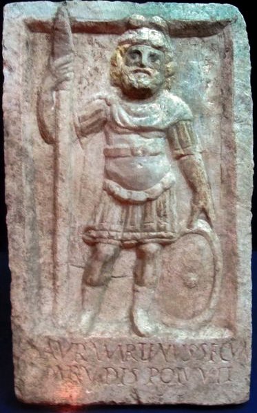 - Über der Inschrift eingetieftes Bildfeld mit mythischer Figur: bärtiger Mars mit Helm, Panzer, Stiefeln, in der Rechten Lanze, die Linke auf dem Schild.