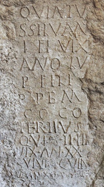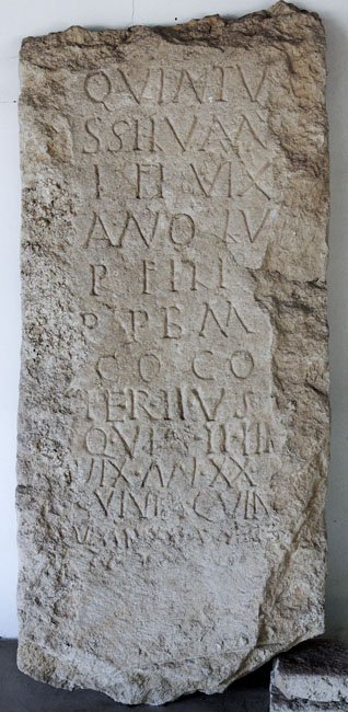 - Quintu/s Silum/i fi(lius) vix(it) / an(n)o(s) LV[-?] / p(osuerunt?) fili(i) / p(atri?) p(iissimo?) b(ene) m(erenti) / co() co() / Tertius (?) / Qui(nti?) II III(?) / vix(it) an(nos) XX / vivi(?) Quin() / vixit [---] / [------]